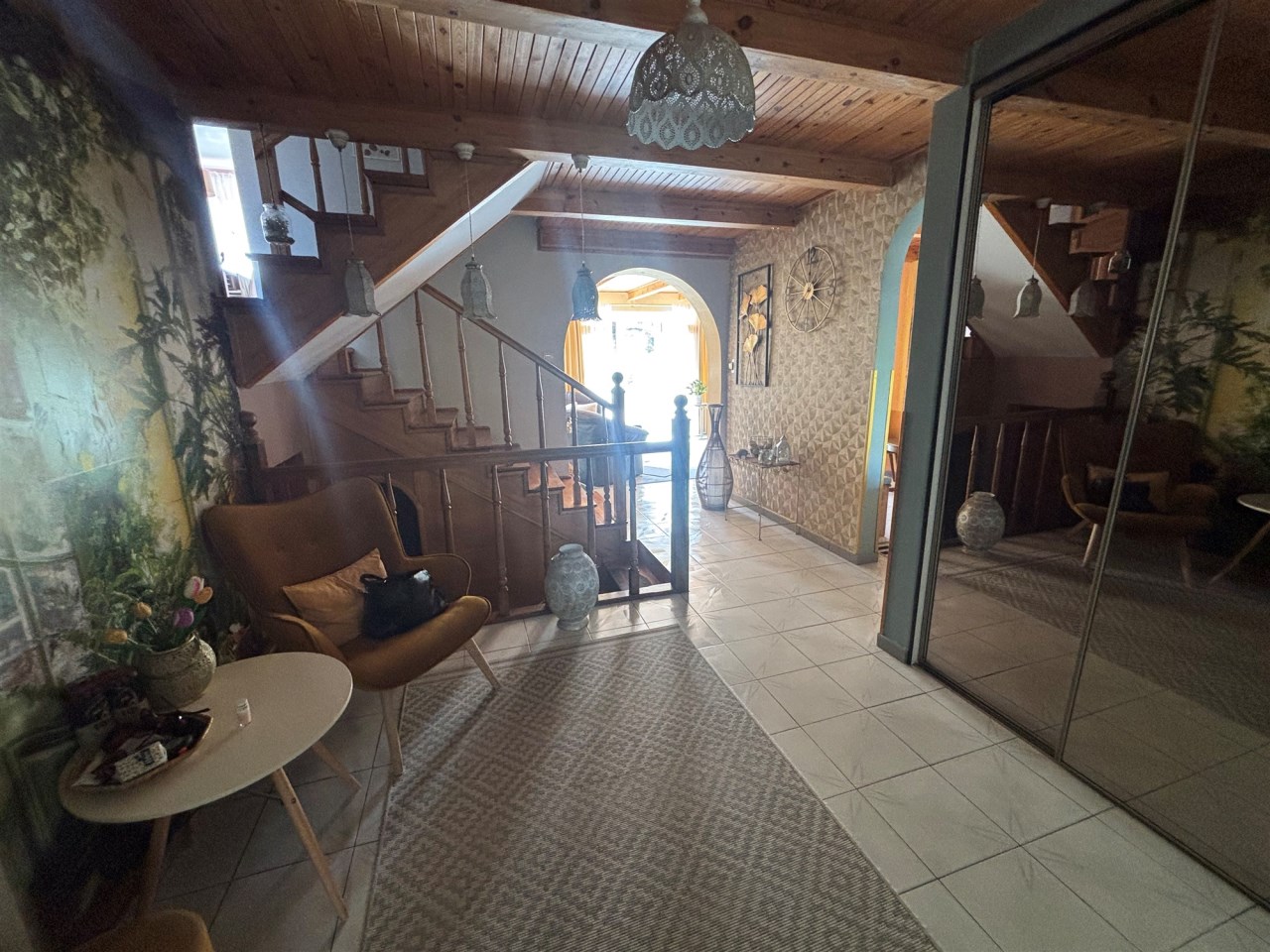 Dom ma ciekawy, zróżnicowany układ poziomów z otwartą klatką schodową.