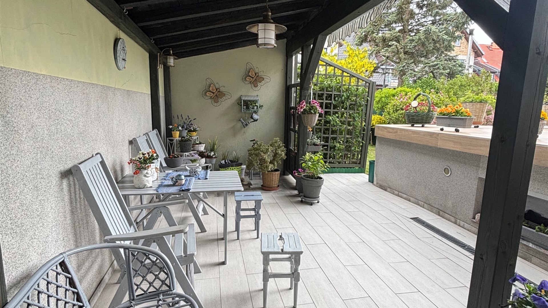 Działka ma 311 m² – z przodu i z tyłu domu znajdują się dwa ogrody (ok. 60 m² i 130 m²), a w części ogrodowej przygotowano taras i wiatę, które sprzyjają relaksowi na świeżym powietrzu.