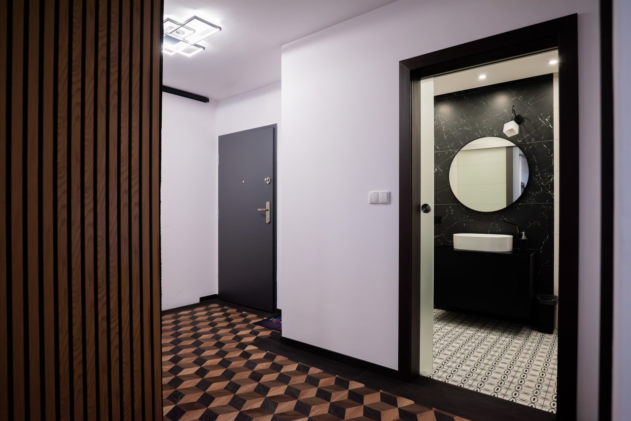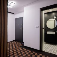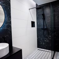 Łazienka to poziom, który zwykle widzi się w dobrych hotelach czarny i biały marmur, minimalistyczna forma, dopracowane detale.