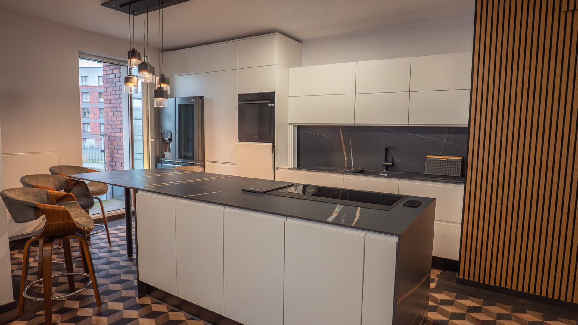 Wyspa kuchenna i otwarty aneks to naturalne centrum życia: gotujesz, jesz, rozmawiasz, a zaraz za tobą jest widok i światło.